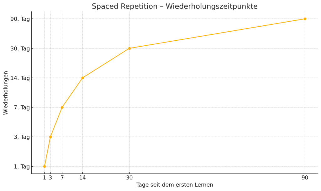 Das bedeutet: Du wiederholst denselben Stoff mehrmals, aber in wachsenden Abständen. Und genau das hilft deinem Gehirn, die Information langfristig abzuspeichern.